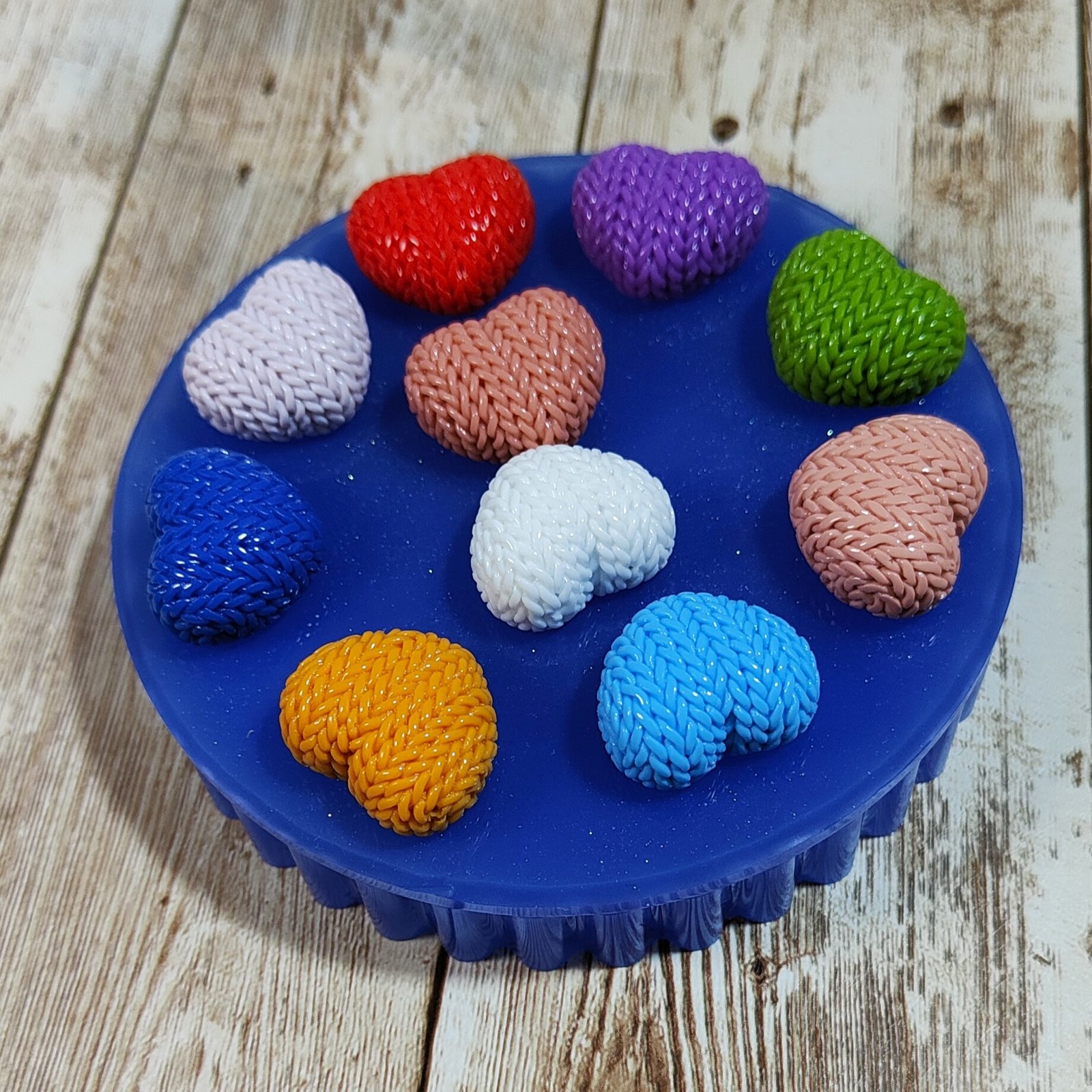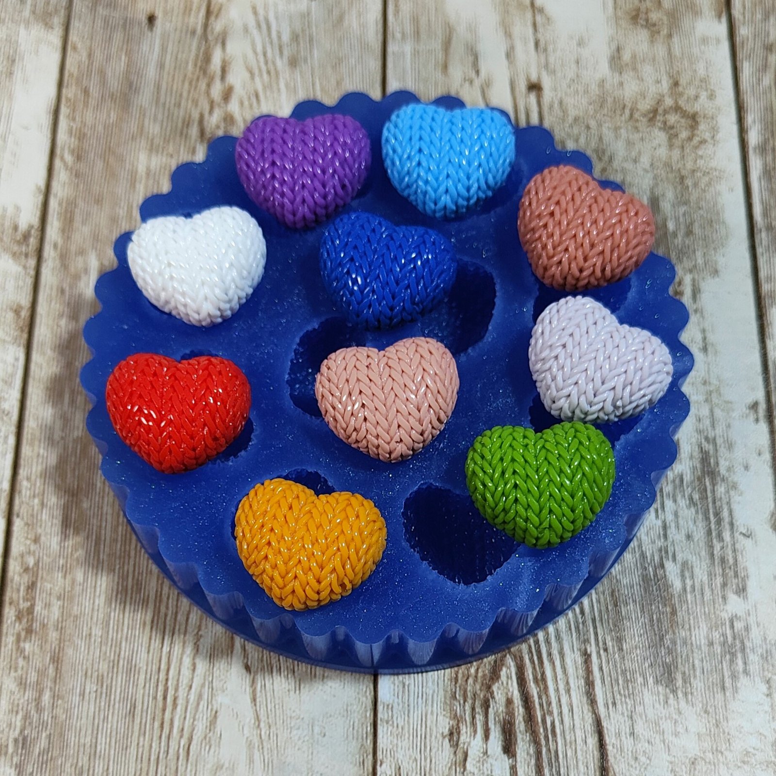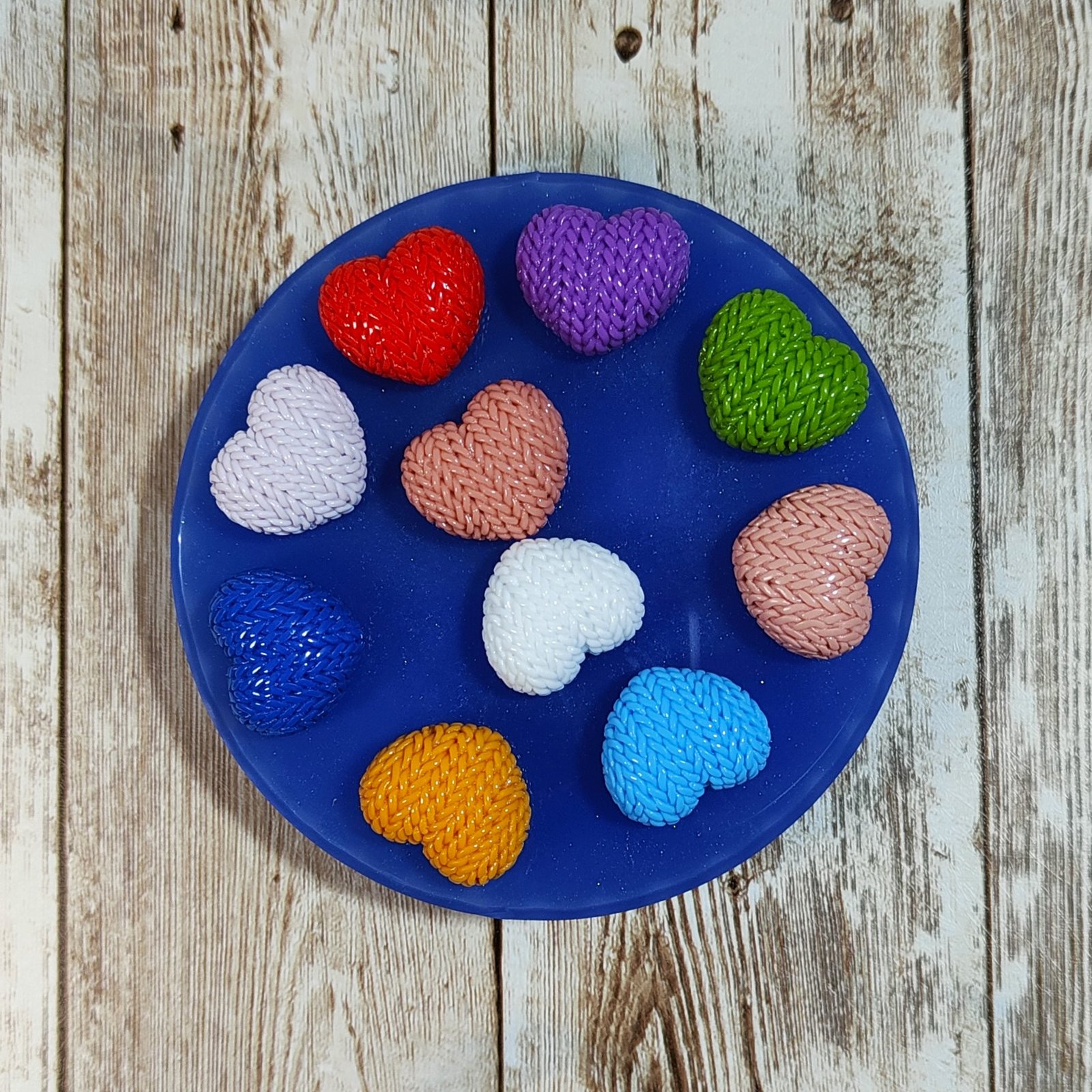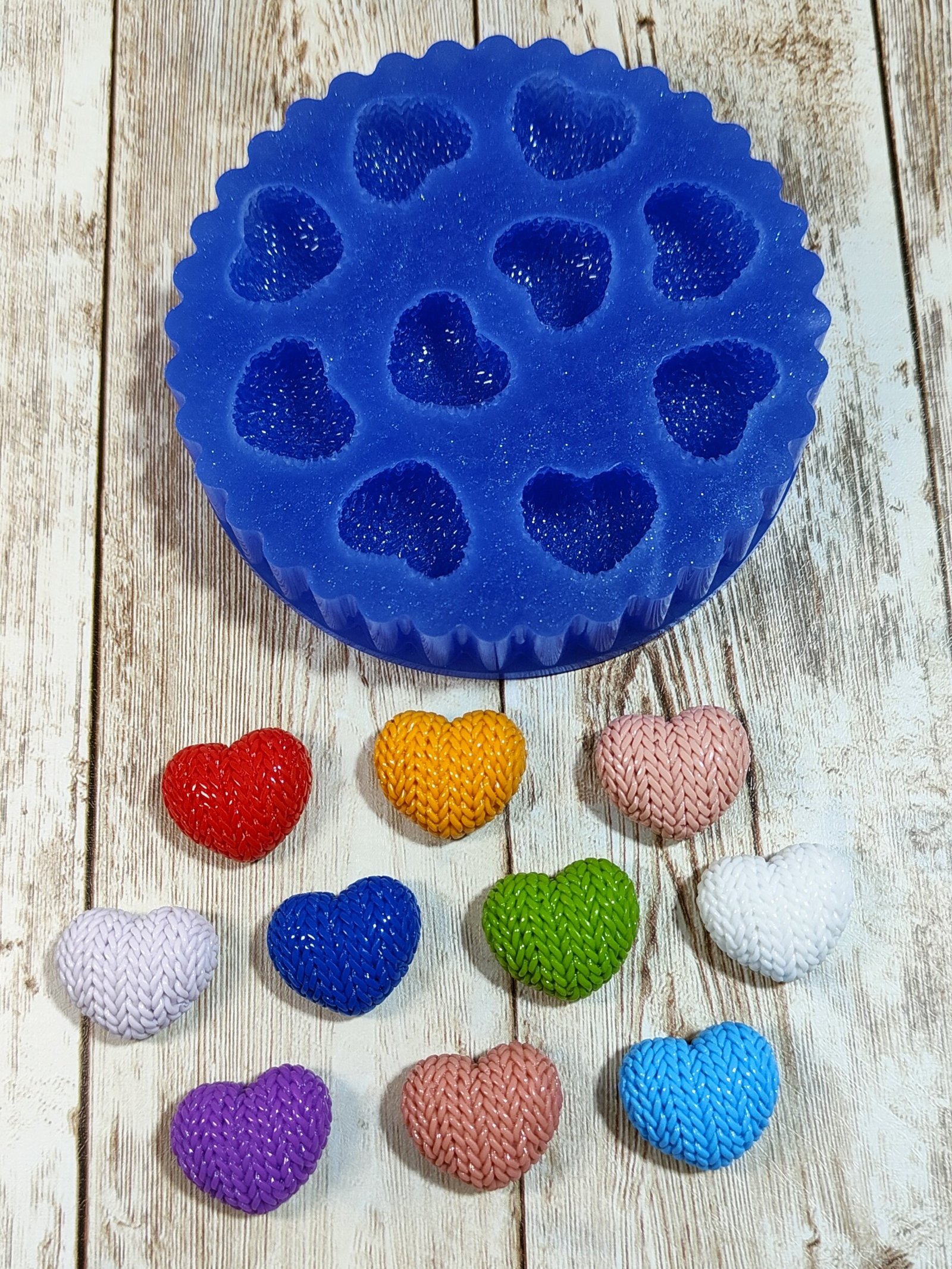 Stampo 10 Cuori trama maglione 2CM in silicone per creazioni in resina, gesso, paste polimeriche, cera e sapone, lucido e morbido realizzato in gomma siliconica da colata professionale e matrice in resina.