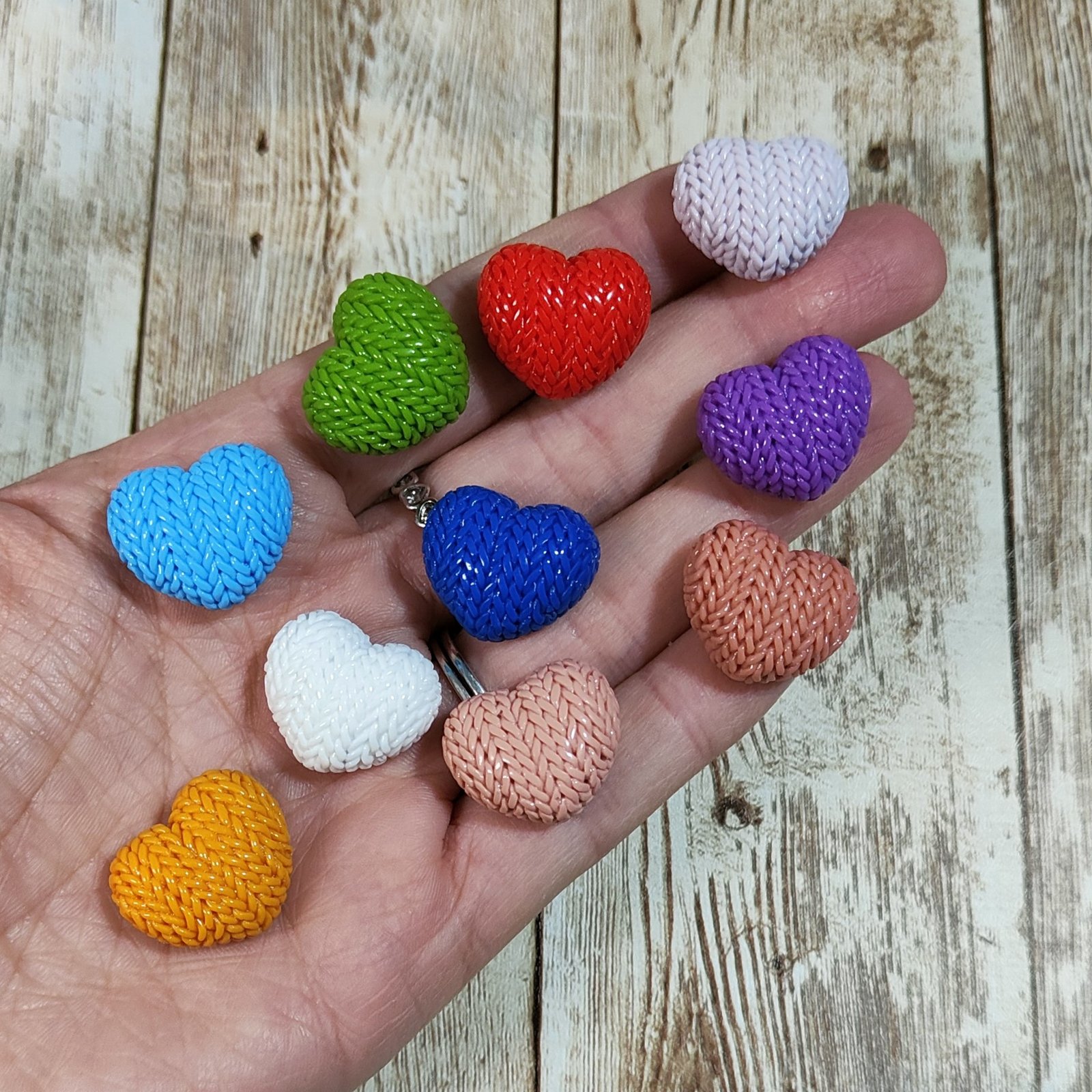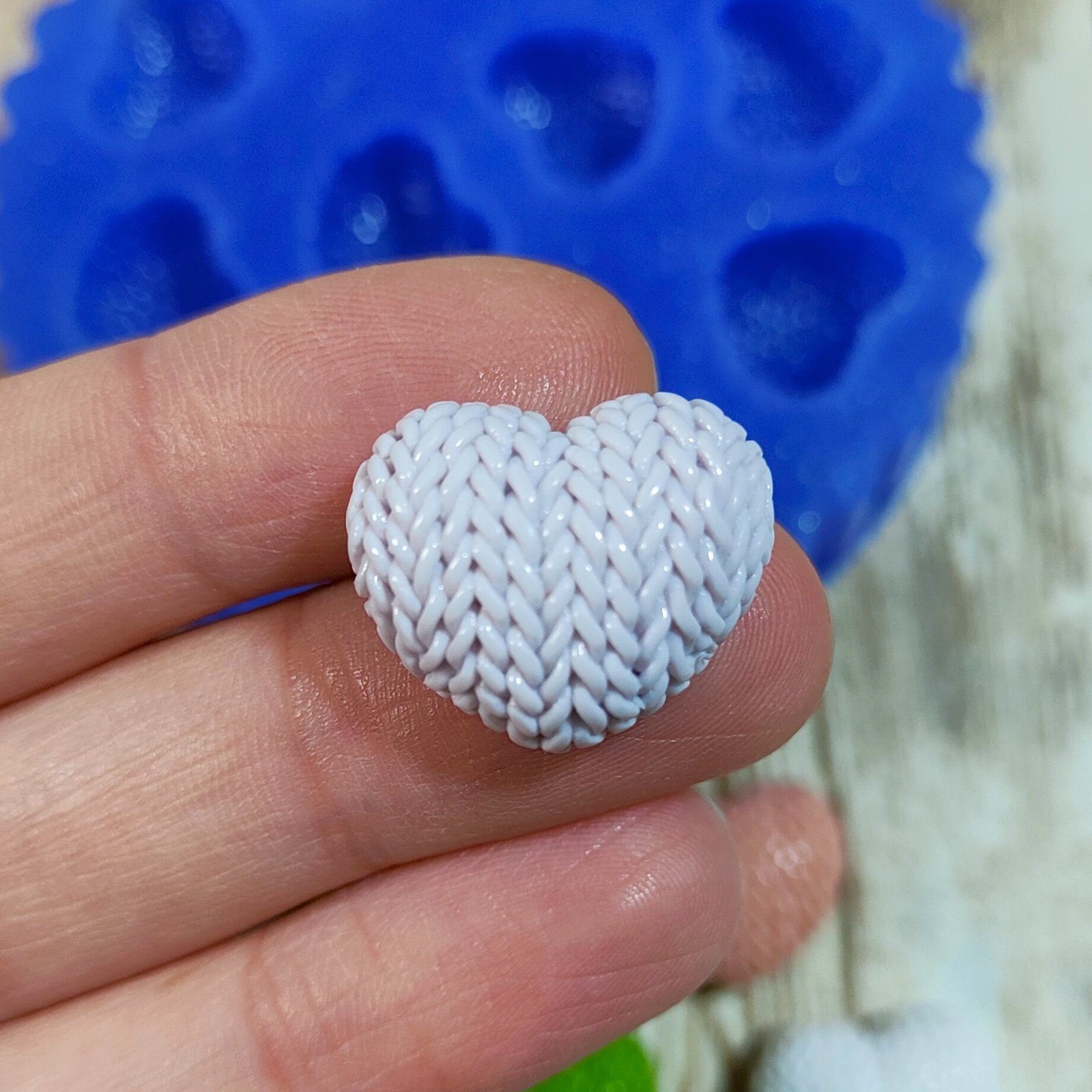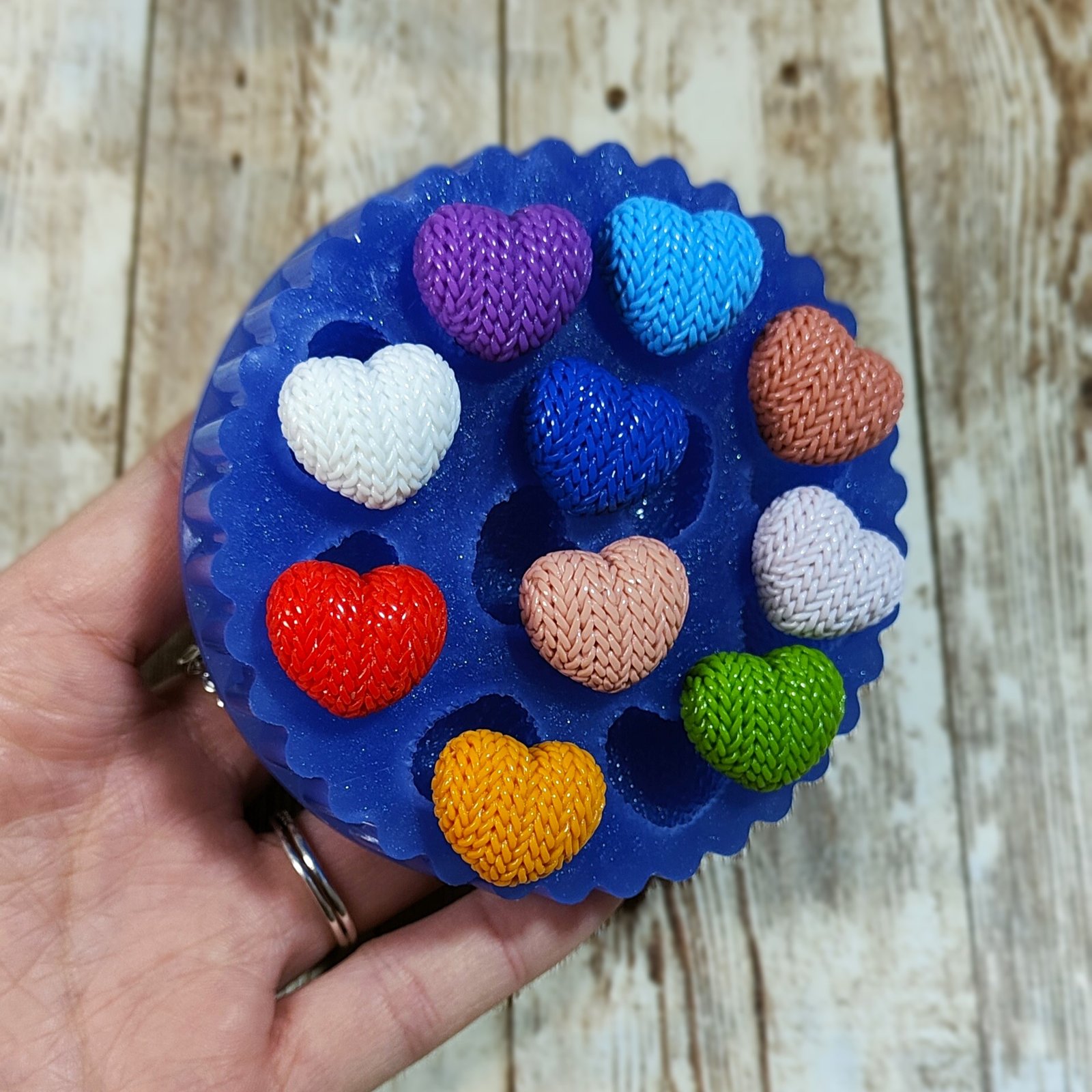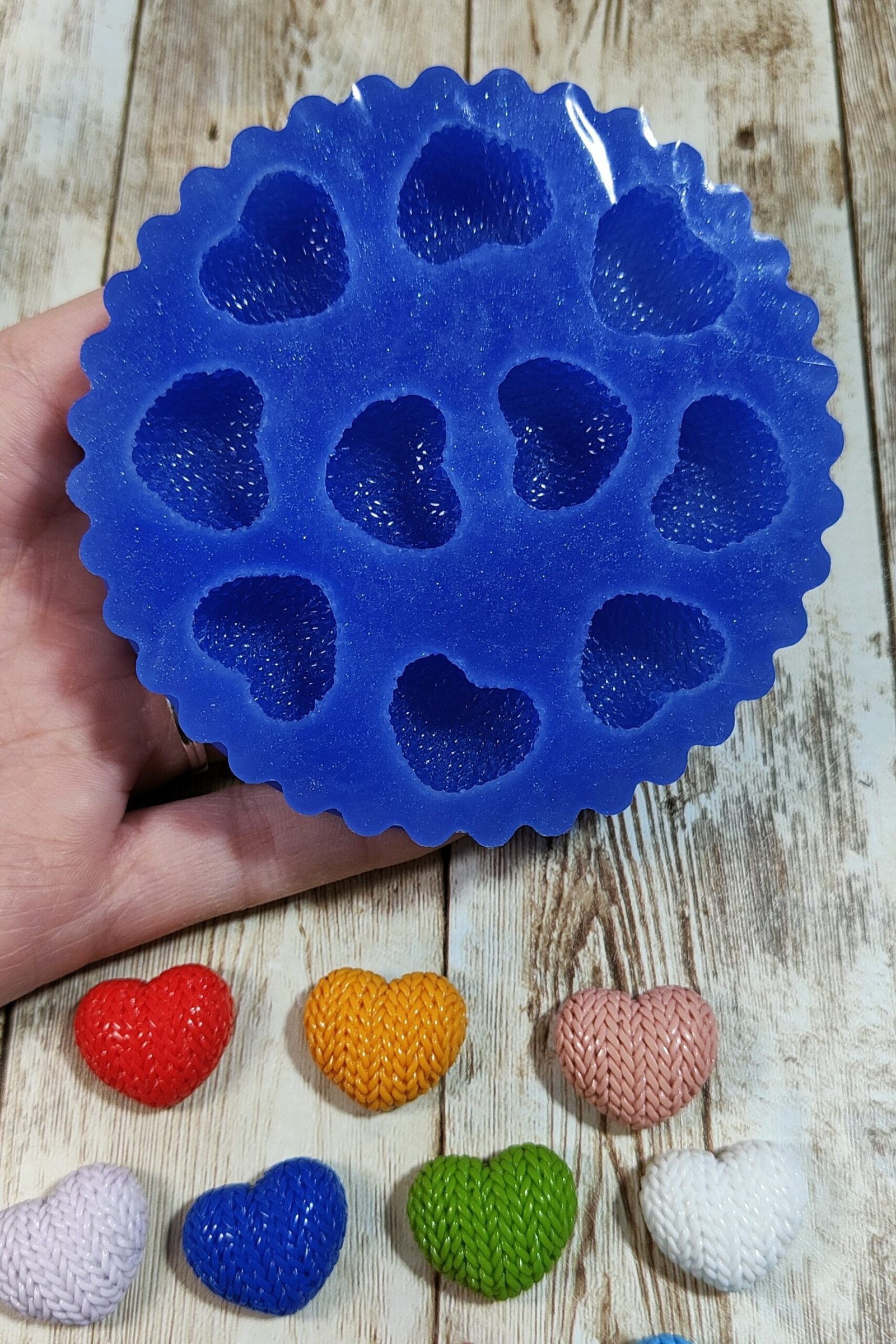 Stampo 10 Cuori trama maglione 2CM in silicone per creazioni in resina, gesso, paste polimeriche, cera e sapone, lucido e morbido realizzato in gomma siliconica da colata professionale e matrice in resina.