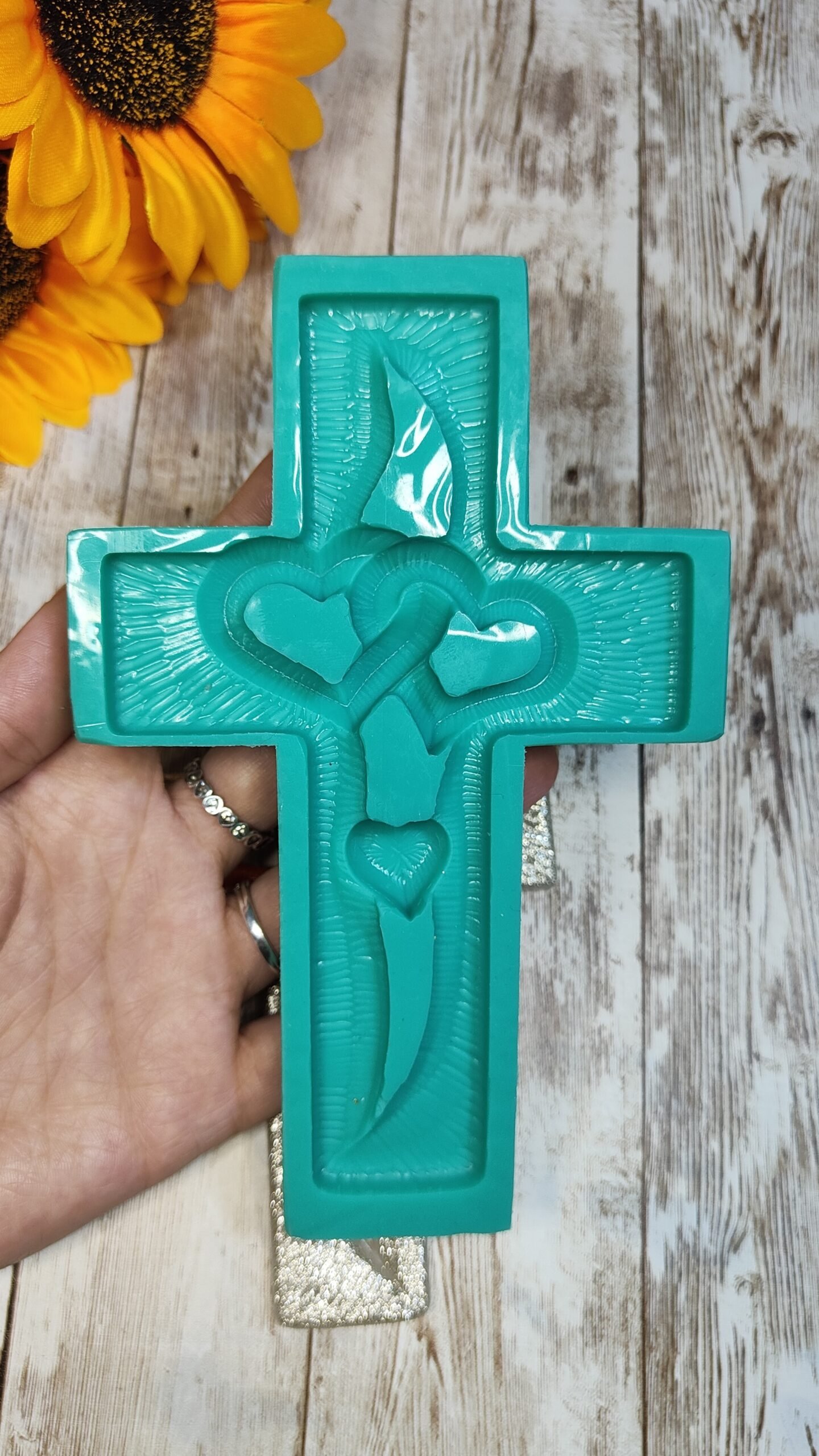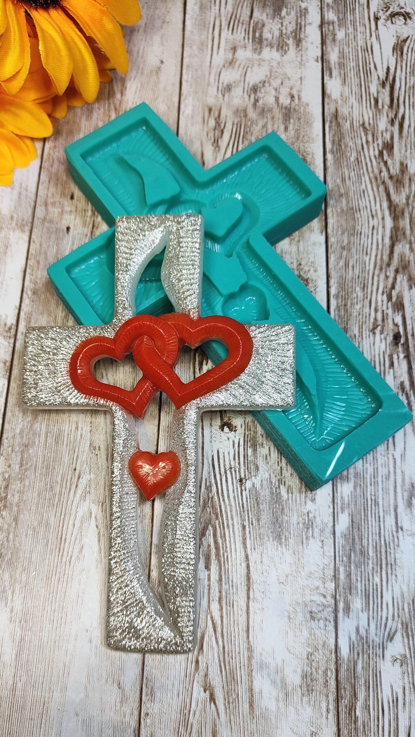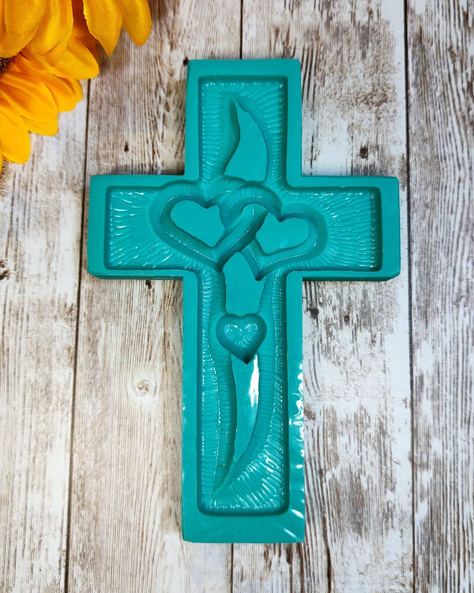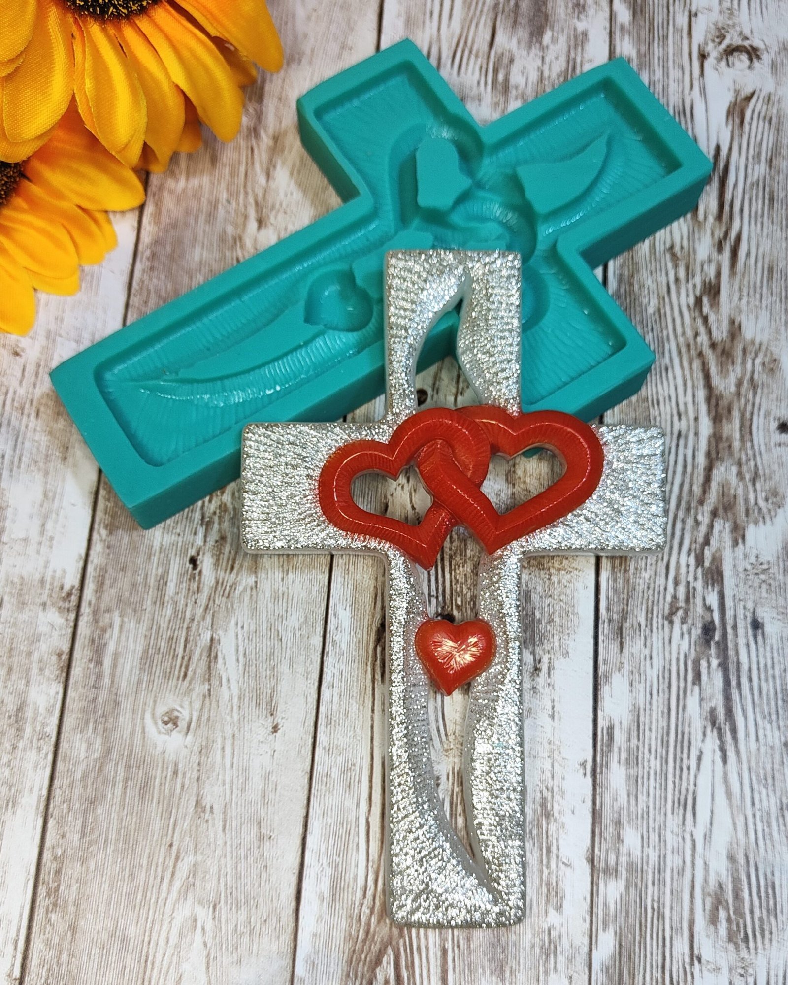Stampo Croce con cuori intrecciati 10x15cm per creazioni in resina, gesso, paste polimeriche, sapone e cera, lucido e morbido realizzato in gomma siliconica da colata professionale e matrice in resina.