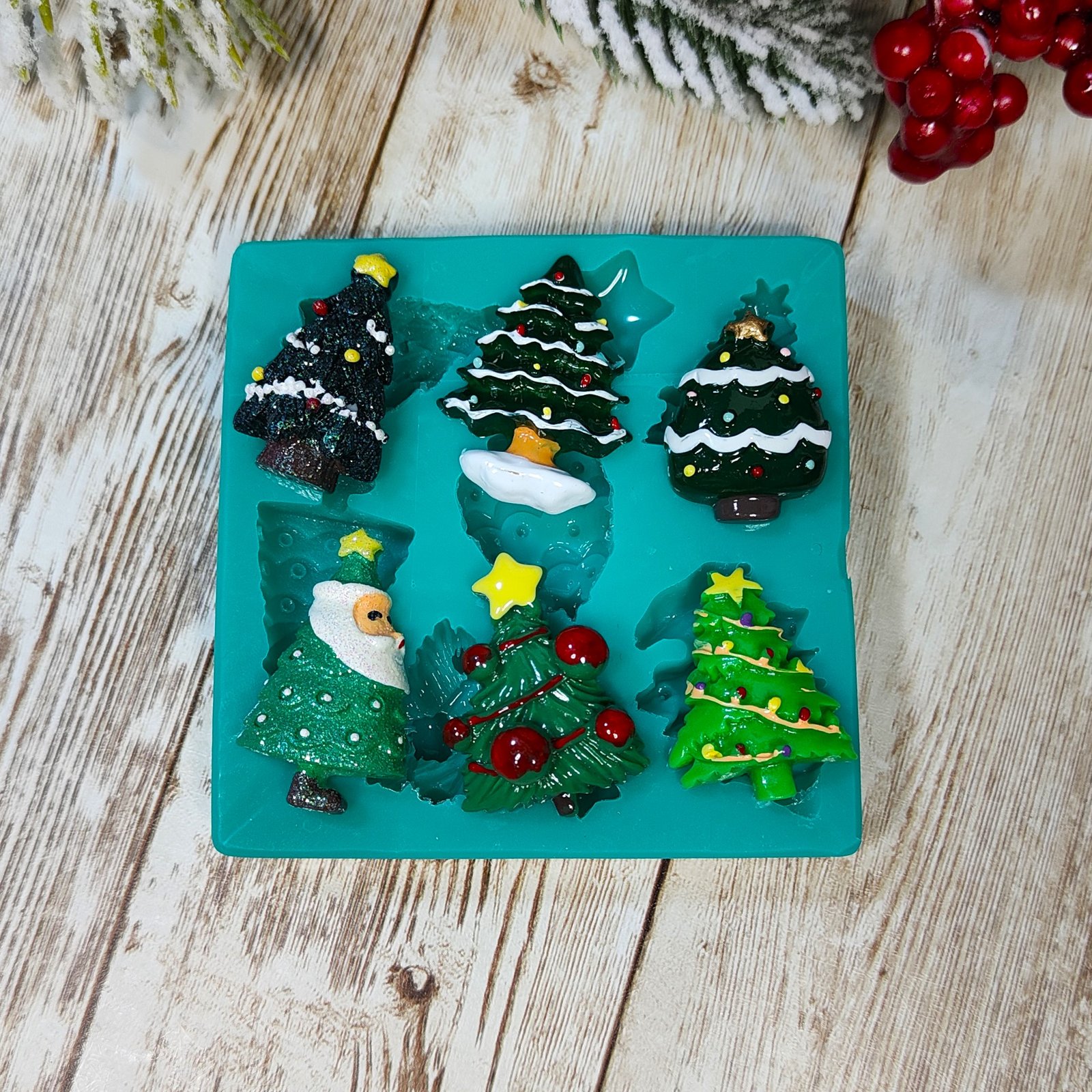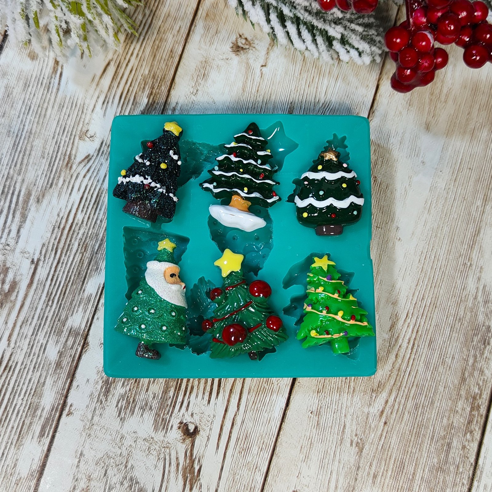 Stampo Alberi di Natale Set 6pz 3cm in silicone per creazioni in resina, gesso, paste polimeriche, sapone e cera, semi-lucido e morbido realizzato in gomma siliconica da colata professionale e matrice in resina.