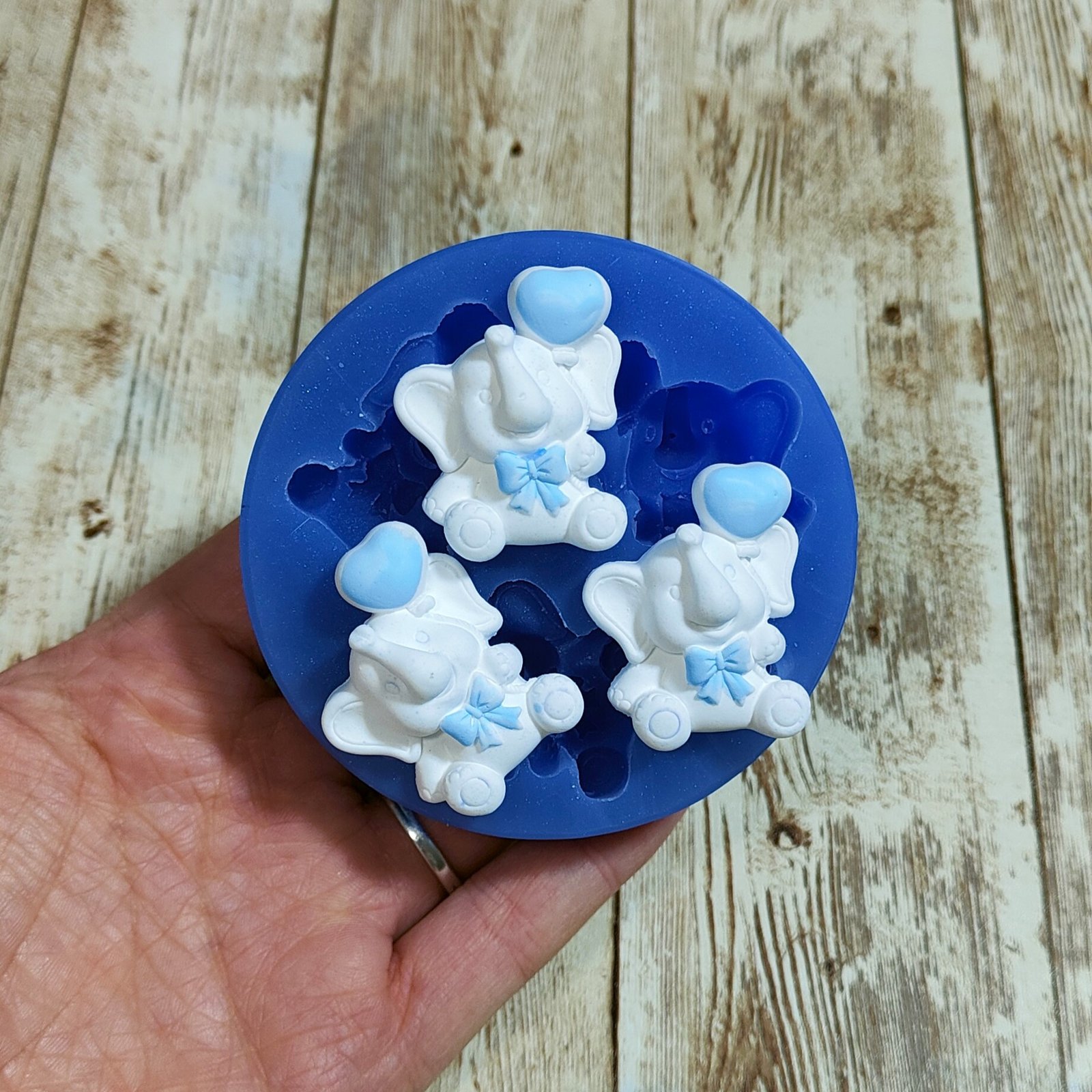 Stampo Elefanti con Palloncino 3pz 3CM in silicone per creazioni in resina, gesso, sapone, cera e paste polimeriche, opaco e morbido realizzato in gomma siliconica da colata professionale e matrice in resina.