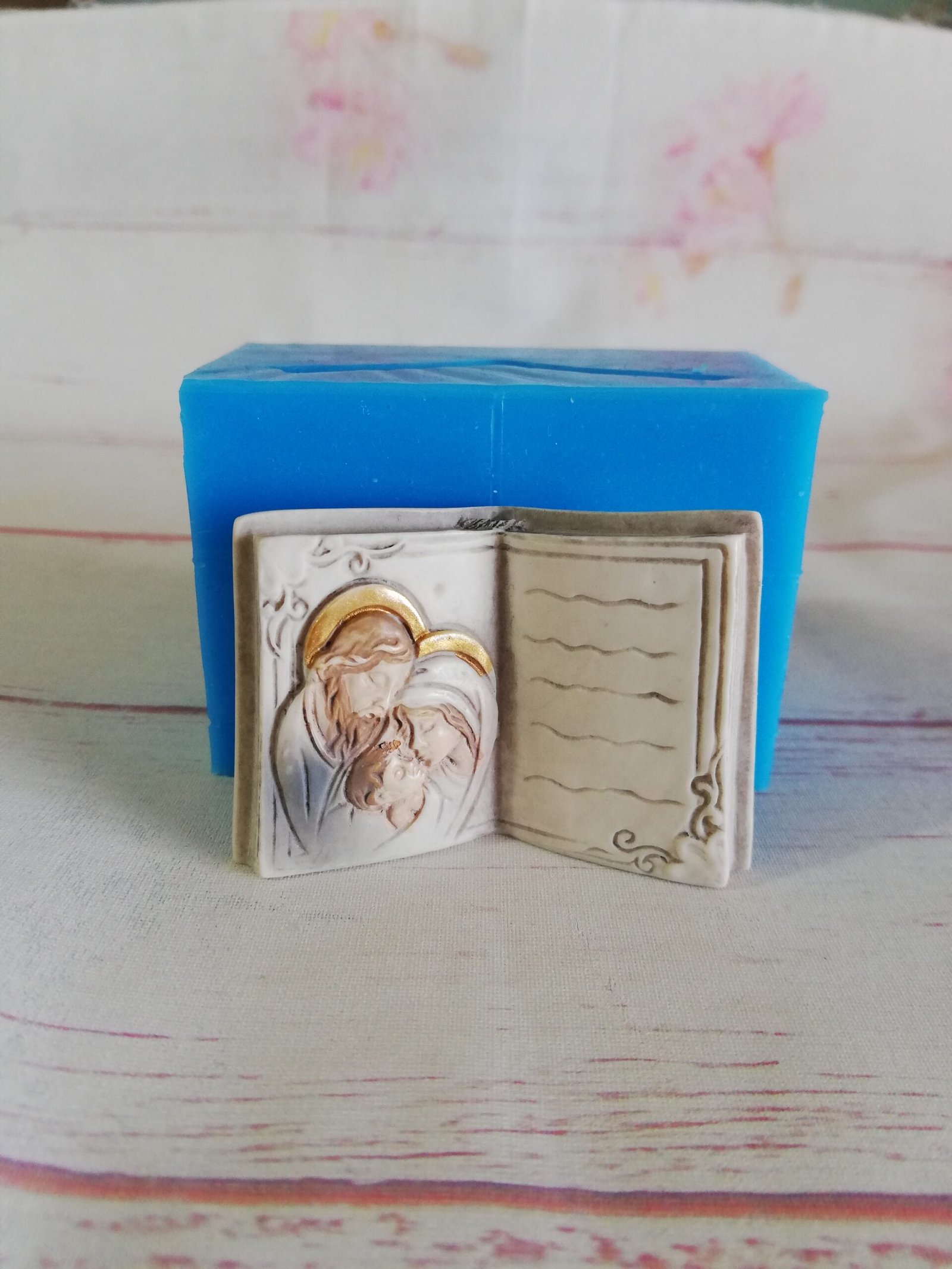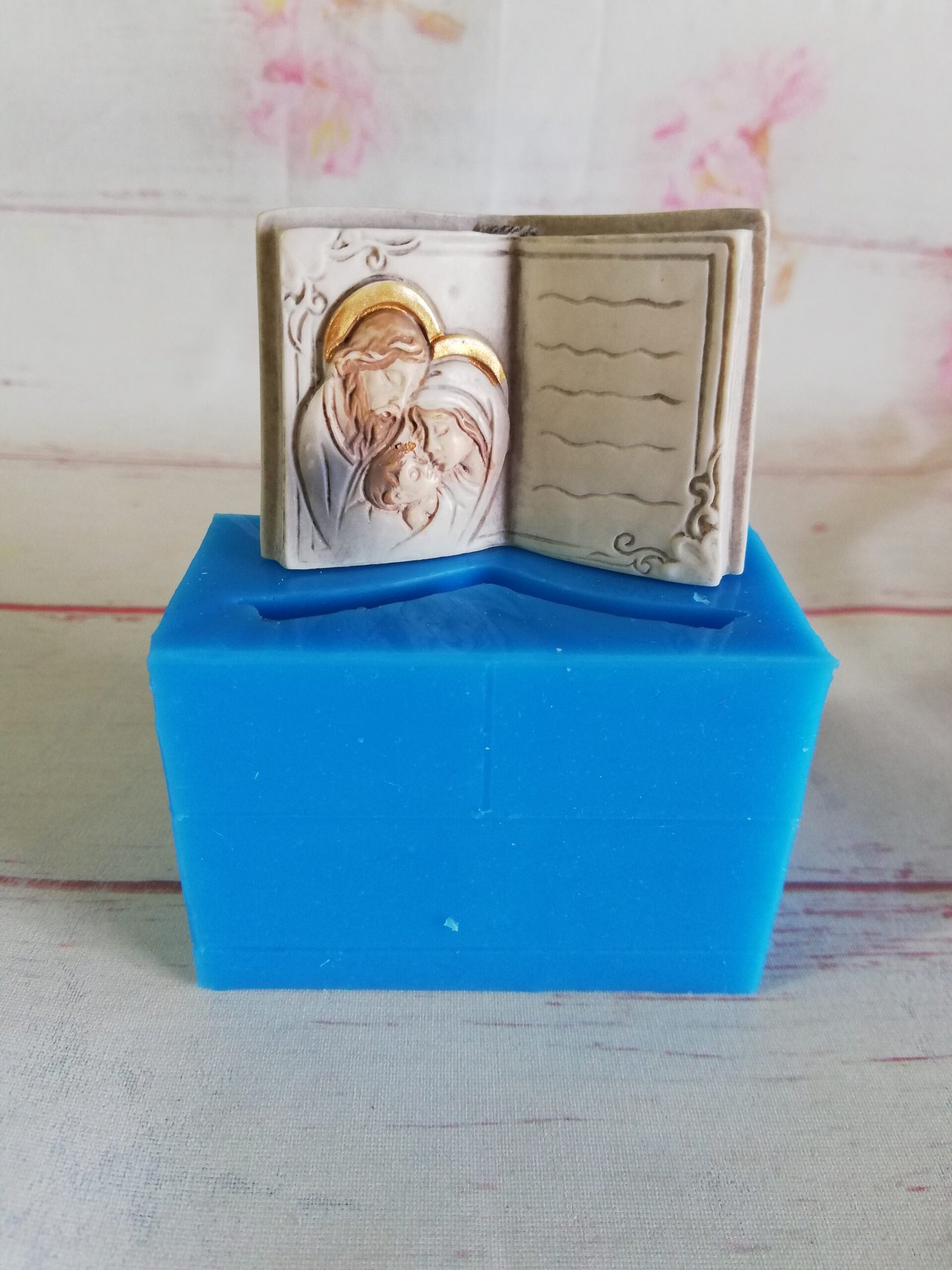 Stampo in silicone Libro 3D Natività Sacra Famiglia per creazioni in resina e gesso, semi-lucido e morbido realizzato in gomma siliconica da colata professionale e matrice in resina.